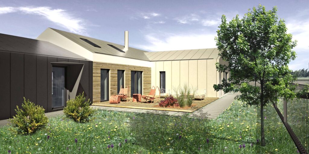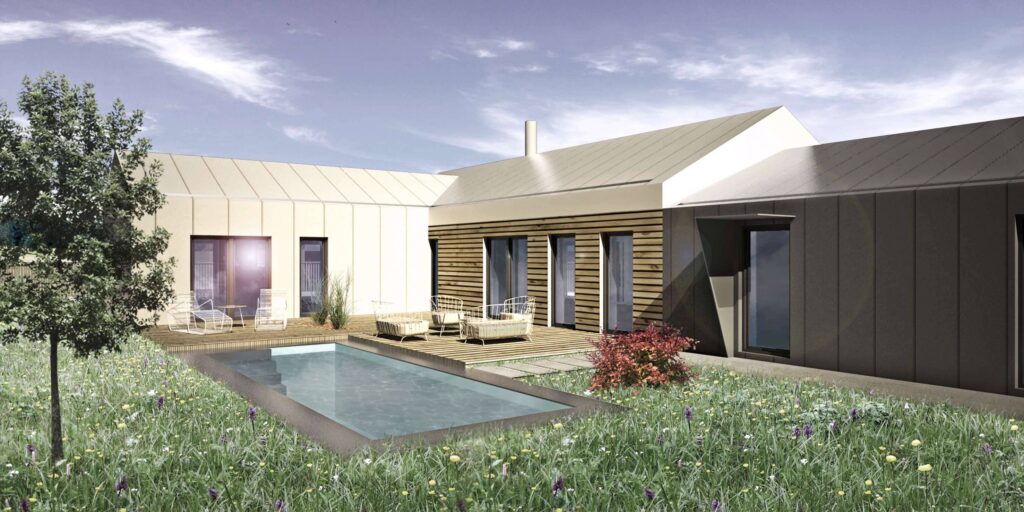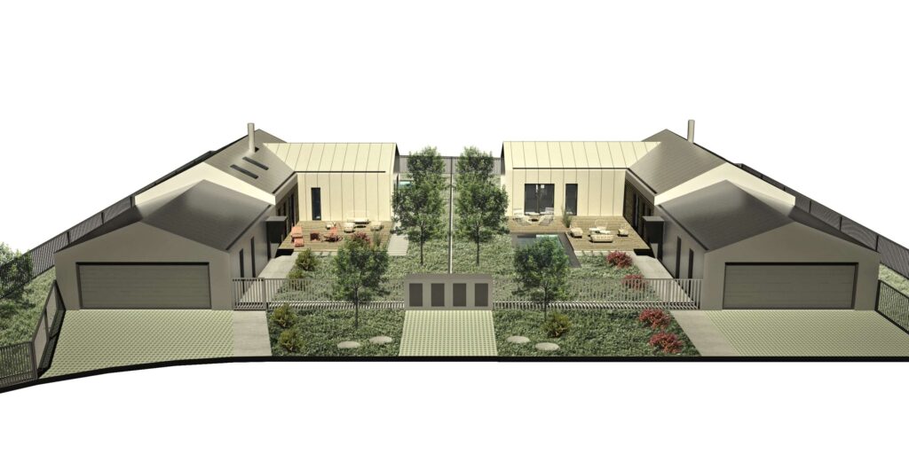 Oba domy mají půdorys ve tvaru L a sedlovou střechu, která je výškově členěná dle jednotlivých funkčních zón.