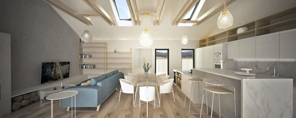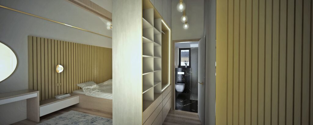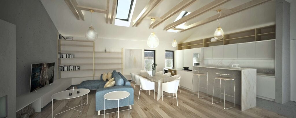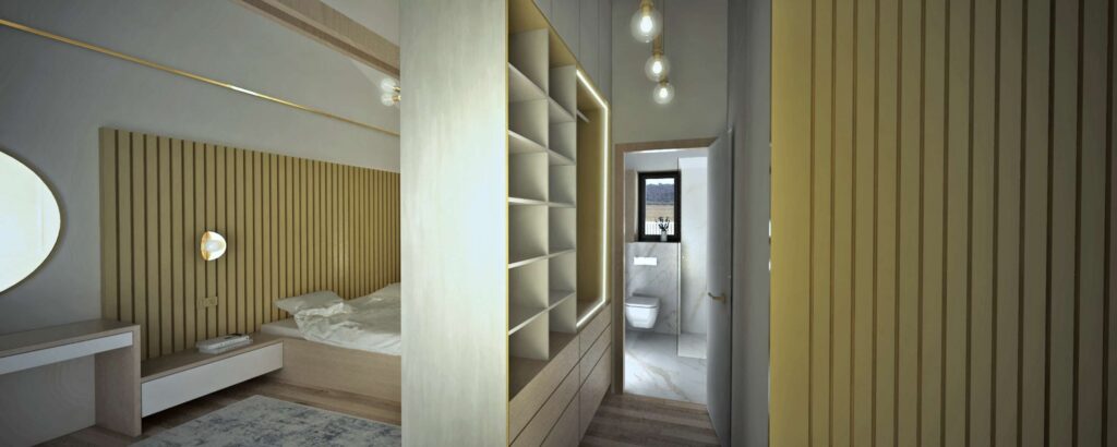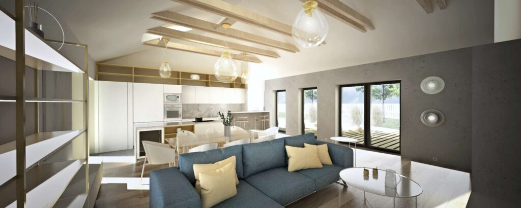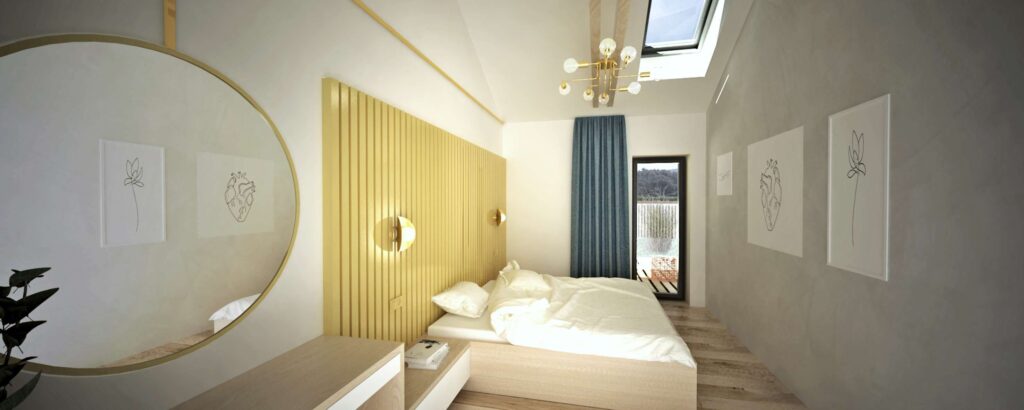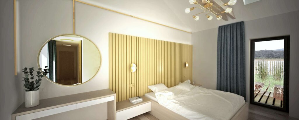 Dispozičně se jedná o 5 + kk, které nabízí velkorysý hlavní obytný prostor s kuchyňským koutem, hlavní ložnici se šatnou a koupelnou, dva pokoje se společnou koupelnou a pracovnu. Dispozice je vybavena příslušným zázemím jako je vstupní hala, technická místnost, špíž a menší koupelna u vstupu. Součástí domů je vždy garáž se dvěma parkovacími stáními, která nabízí prostor i pro pracovní plochu a dostatek úložného prostoru. Další možnost parkování je na příjezdové ploše před garáží.
