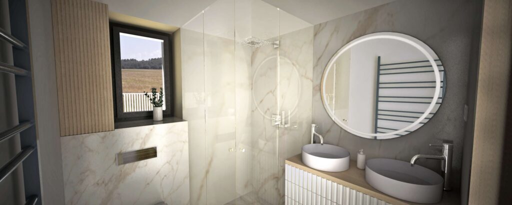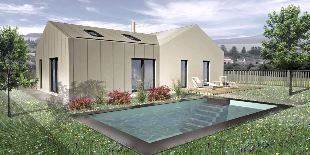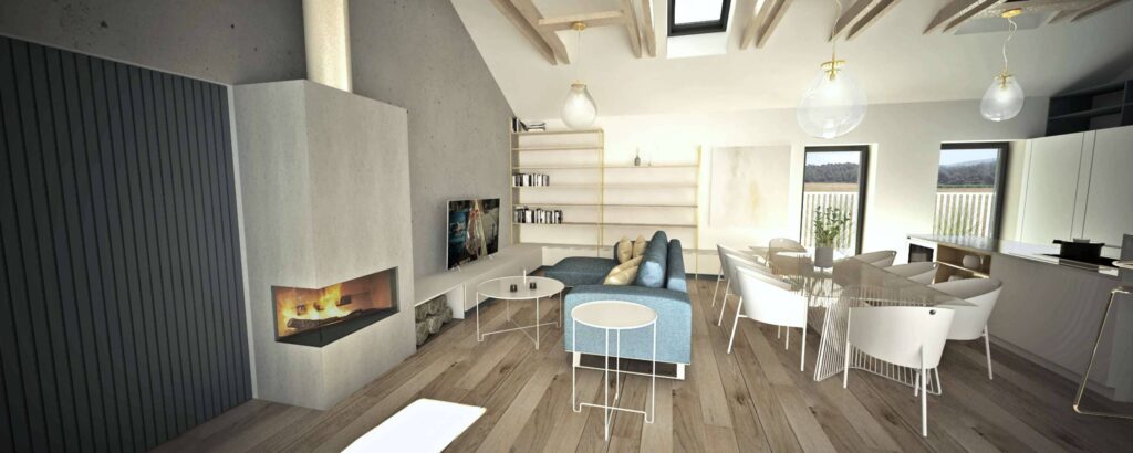 Z materiálového hlediska jsou domy pojednané v kombinaci bílého, béžového a šedého odstínu, který bude vyveden v omítce a plechu. Plechová krytina bude použita na střechách i stěnách domů. Doplňkovým materiálem je dřevěné obložení stěn a teras.