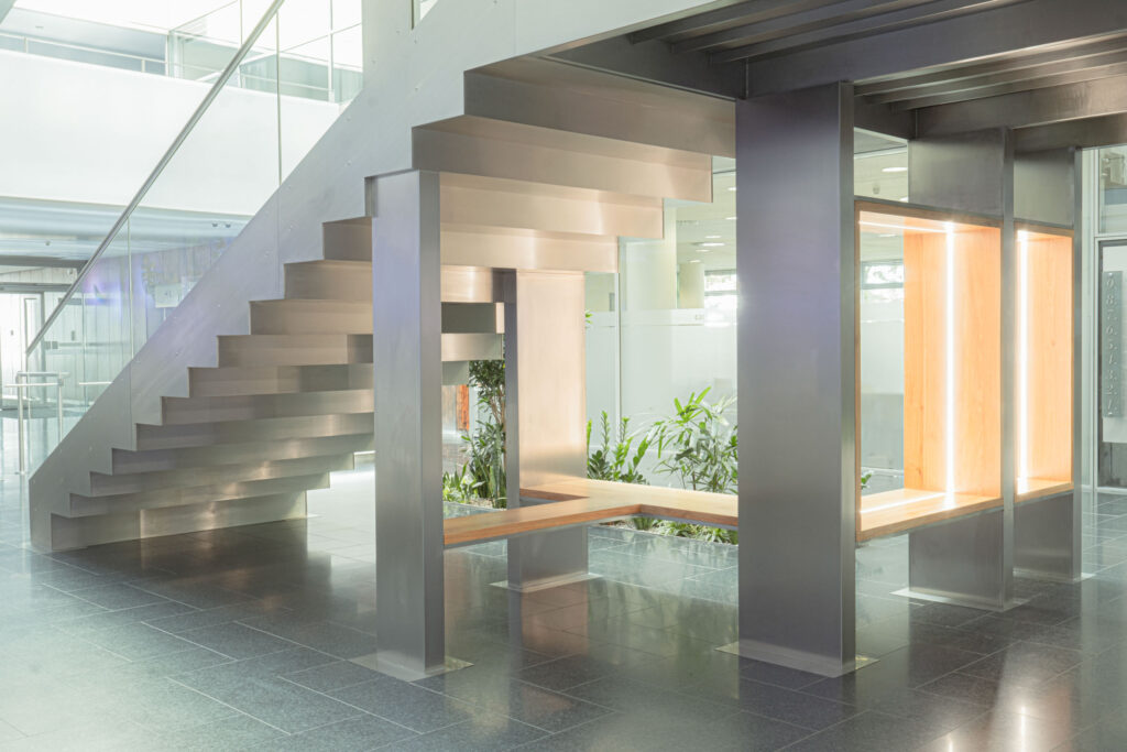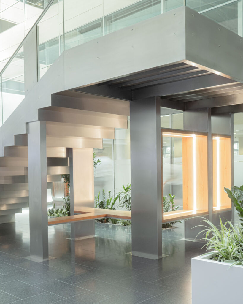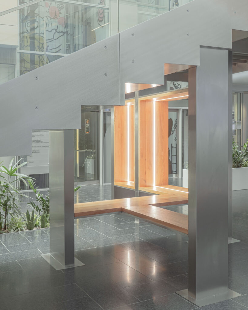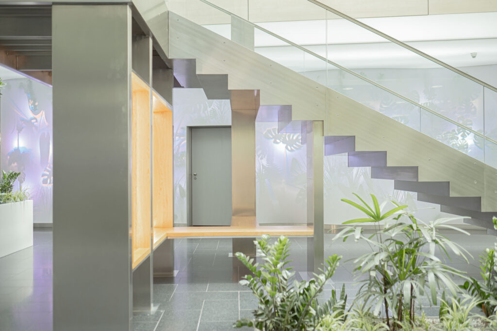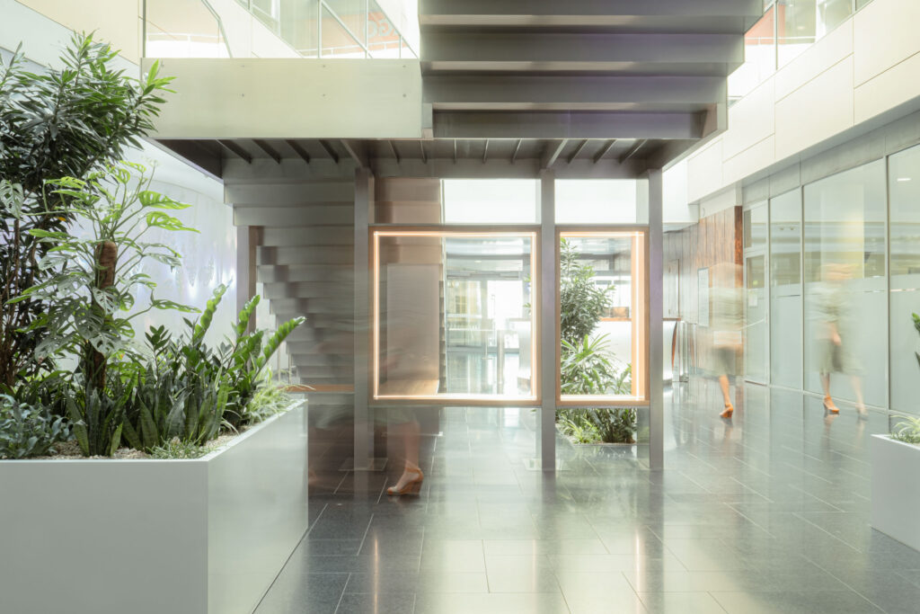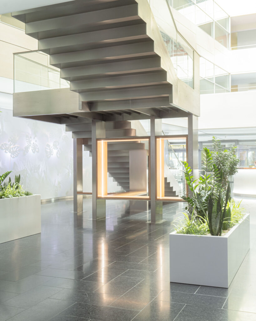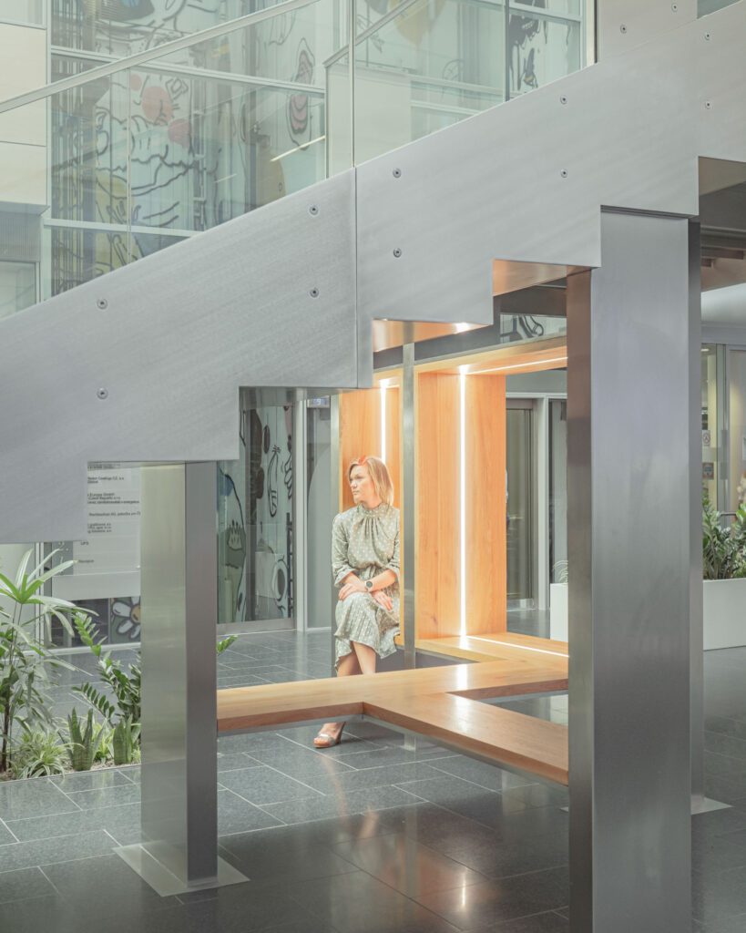Schodiště respektuje původní půdorys, a zároveň do lobby přináší další možnosti jeho využití. Je propojovacím prvkem mezi podlažími, nabízí možnost posezení při čekání na kolegy a spolu s interiérovou zelení dotváří a zpříjemňuje lobby administrativní budovy.