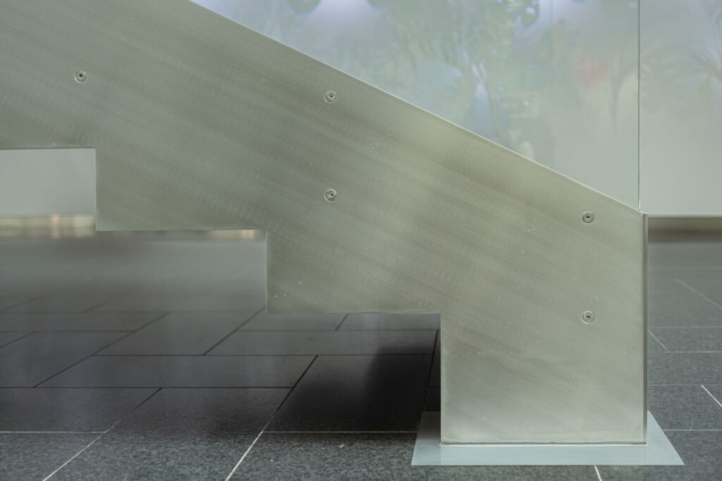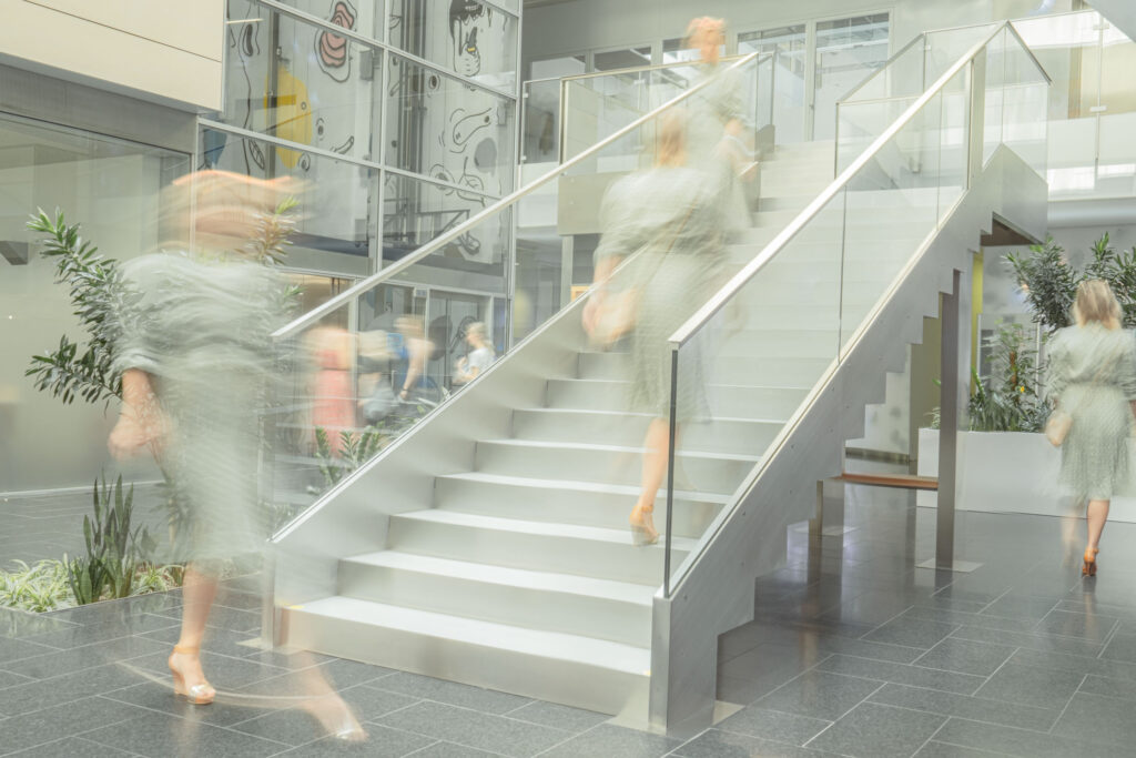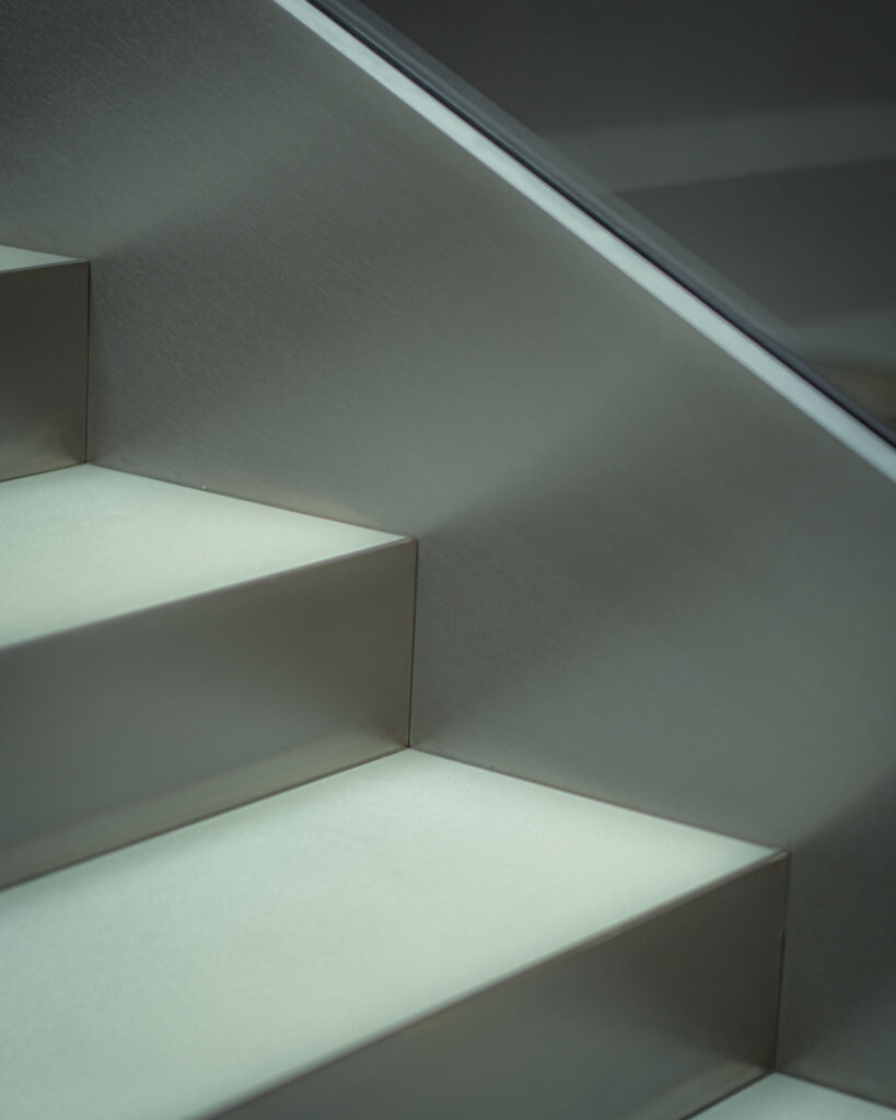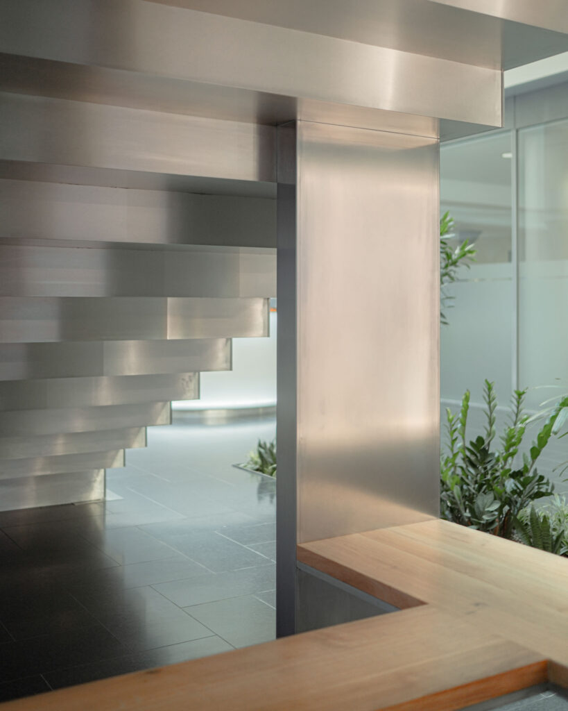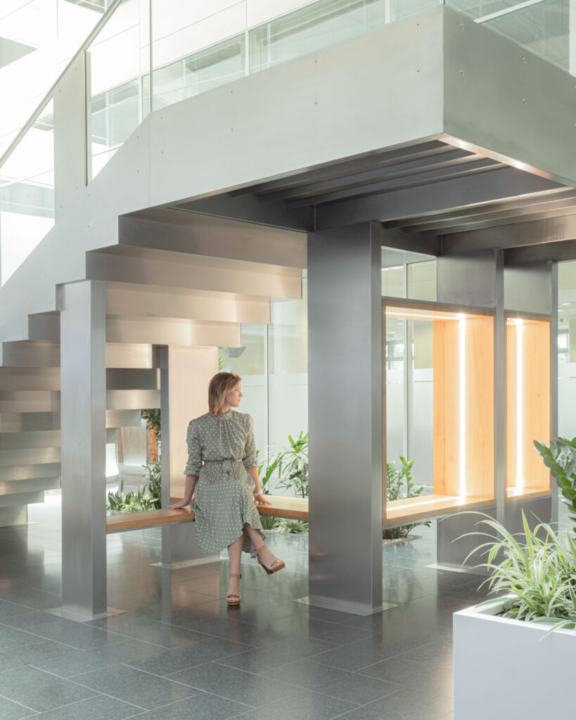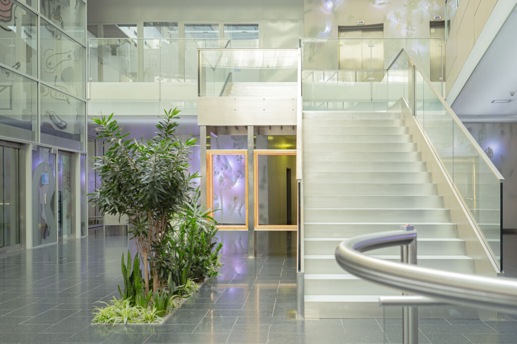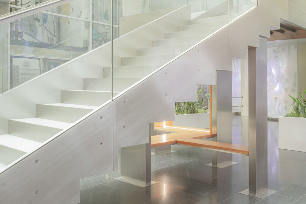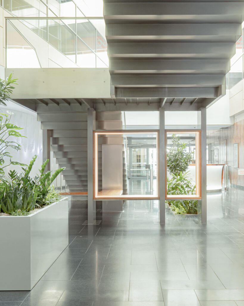 Schodiště respektuje původní půdorys, a zároveň do lobby přináší další možnosti jeho využití. Je propojovacím prvkem mezi podlažími, nabízí možnost posezení při čekání na kolegy a spolu s interiérovou zelení dotváří a zpříjemňuje lobby administrativní budovy.