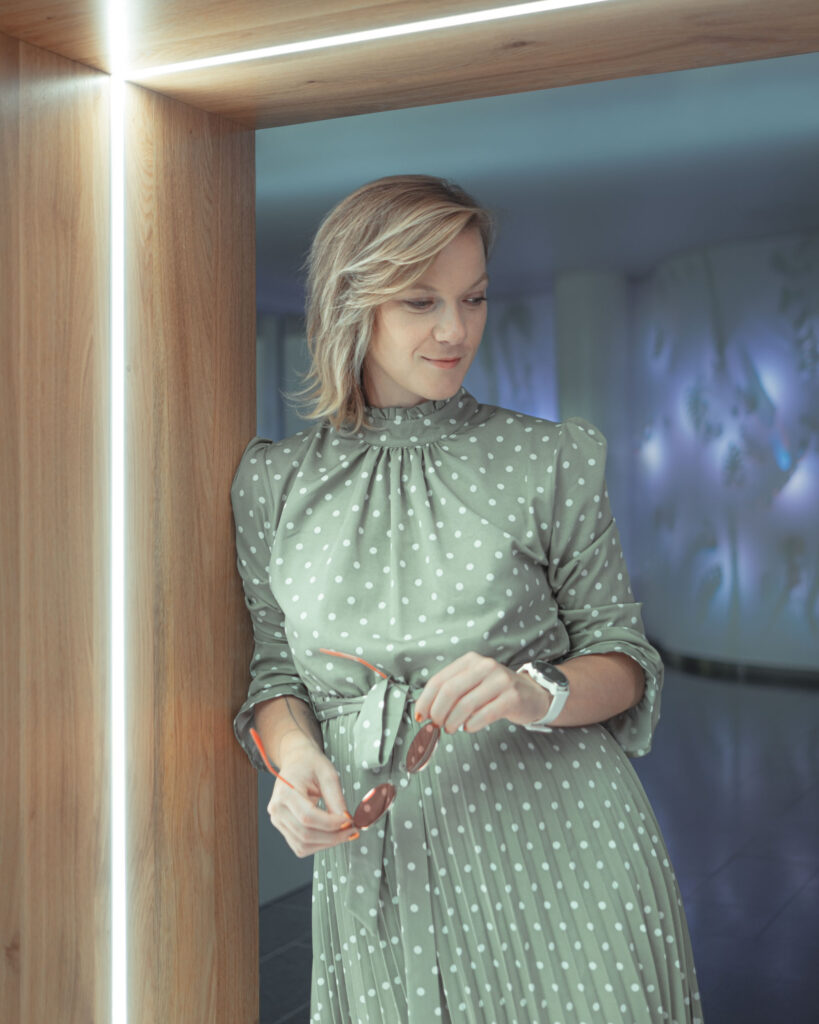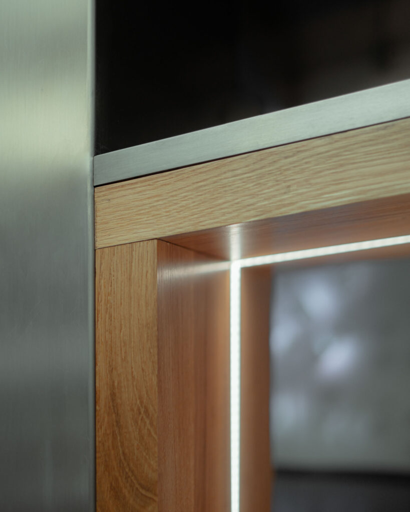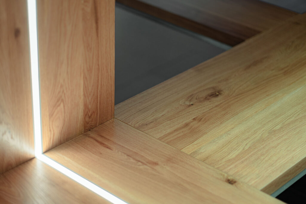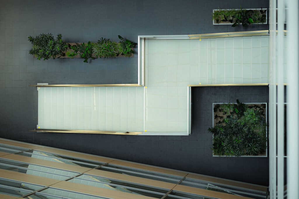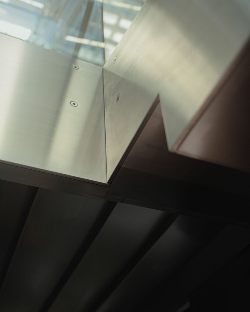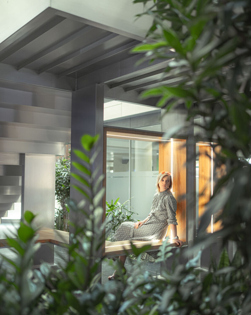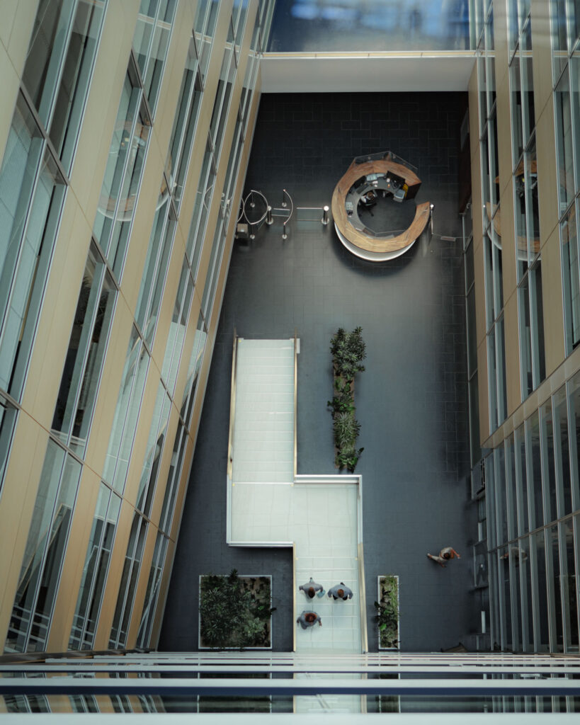 Schodiště respektuje původní půdorys, a zároveň do lobby přináší další možnosti jeho využití. Je propojovacím prvkem mezi podlažími, nabízí možnost posezení při čekání na kolegy a spolu s interiérovou zelení dotváří a zpříjemňuje lobby administrativní budovy.
